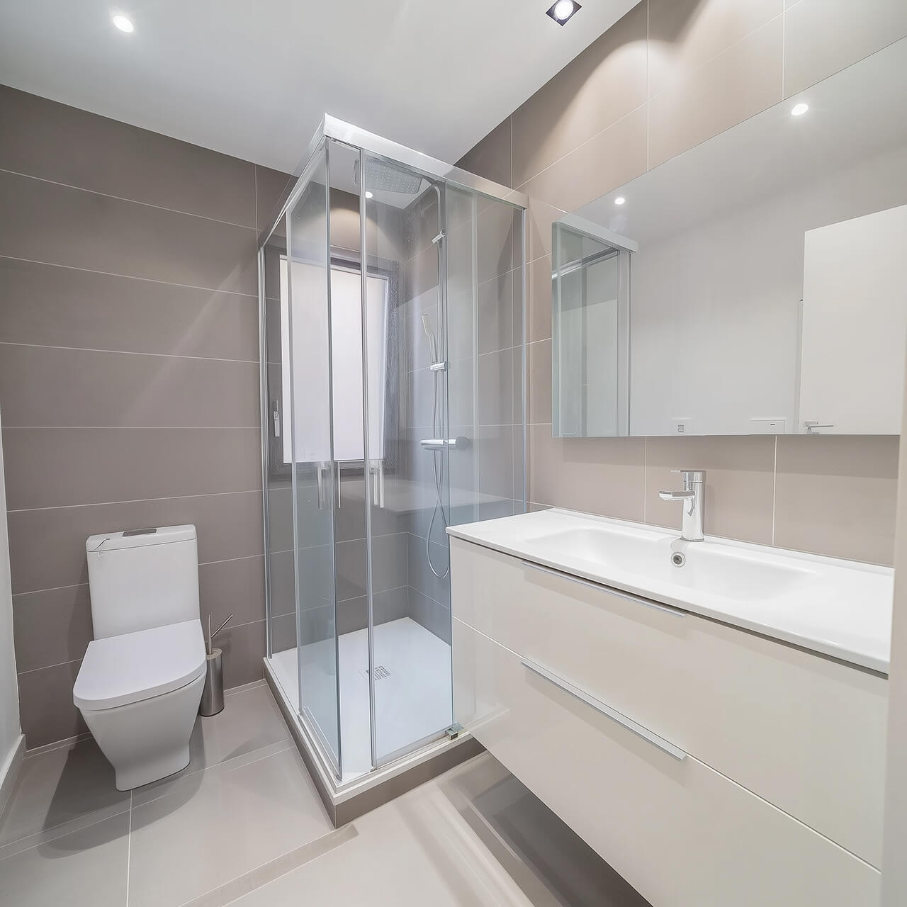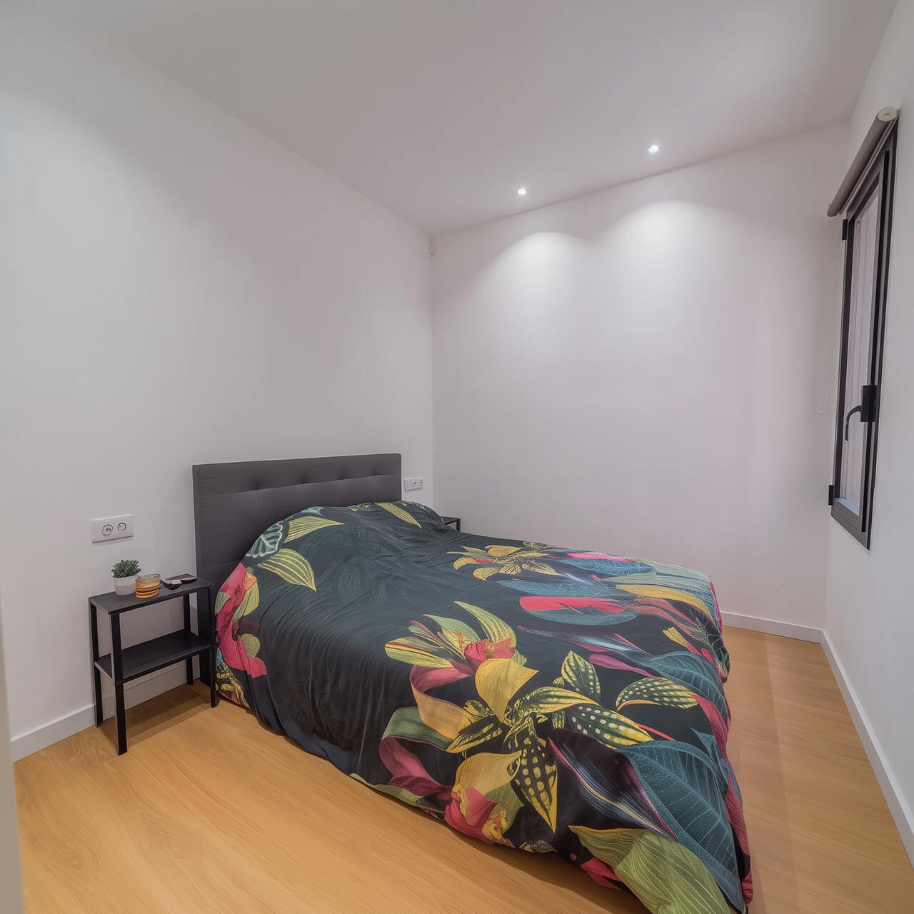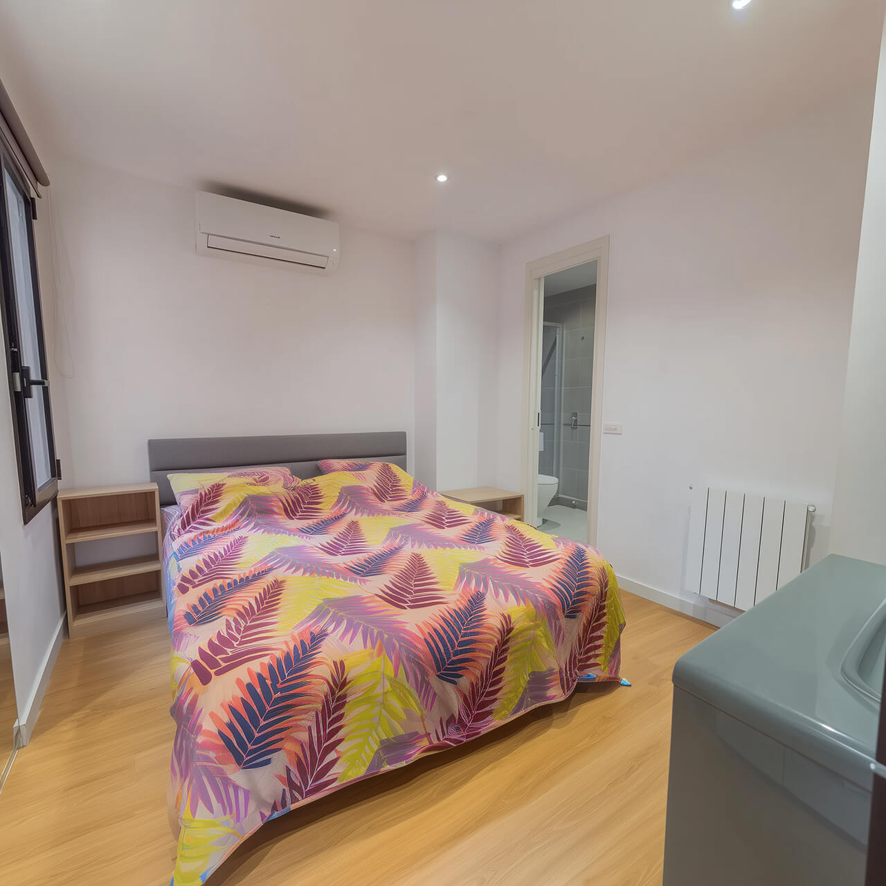 The spacious bedroom is perfect for a comfortable private area. The bathroom is designed in a simple, modern aesthetic, featuring high-quality fixtures and a neat shower stall.