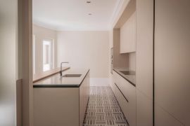La cocina tiene un diseño práctico, con una cómoda encimera y espacio para electrodomésticos. El baño está decorado en tonos neutros. El pasillo ofrece amplio espacio de almacenamiento con armarios.