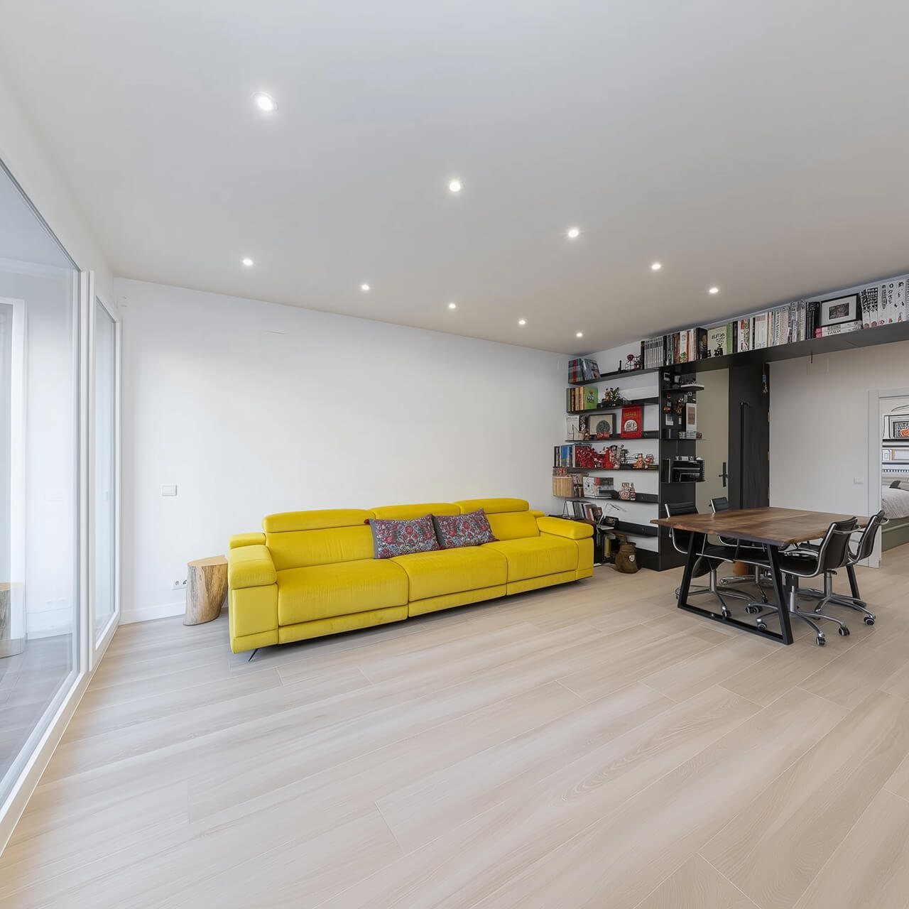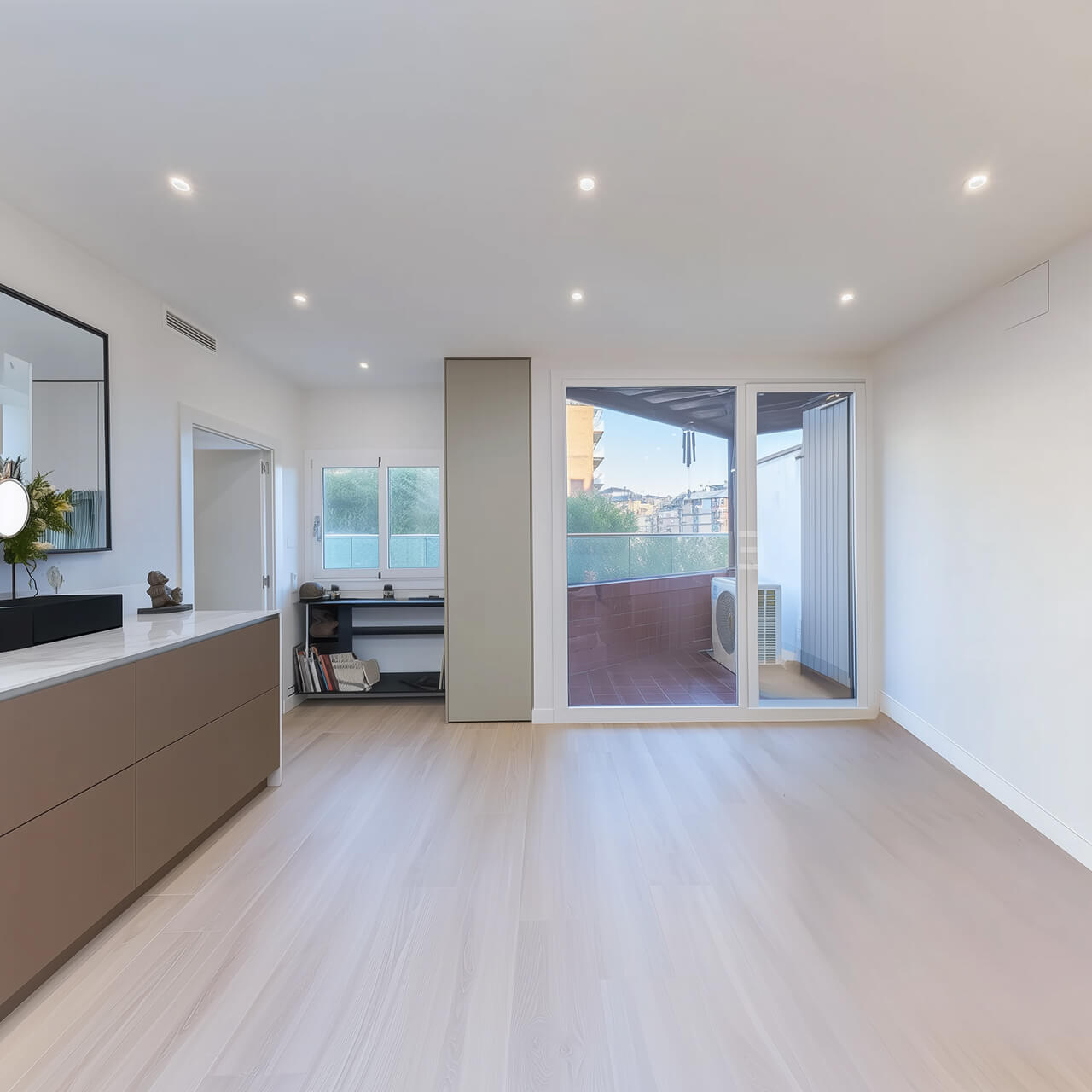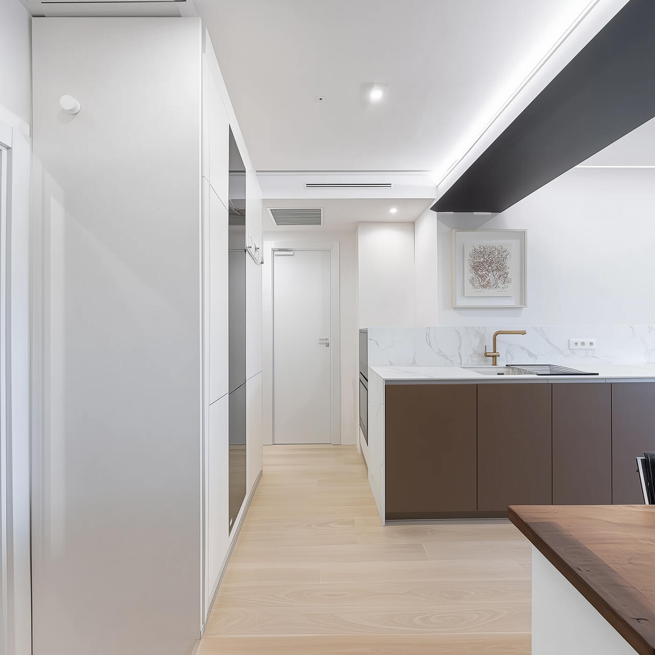 הסלון משלב אזור מנוחה וסביבת עבודה, מה שהופך את החדר לנוח ורב-תכליתי. המטבח מעוצב בסגנון עכשווי: ארונות עץ, משטח עבודה בהיר ועיצוב מינימליסטי יוצרים פנים הרמוני ופונקציונלי. החלל מאפשר בישול נוח וניקוי קל.