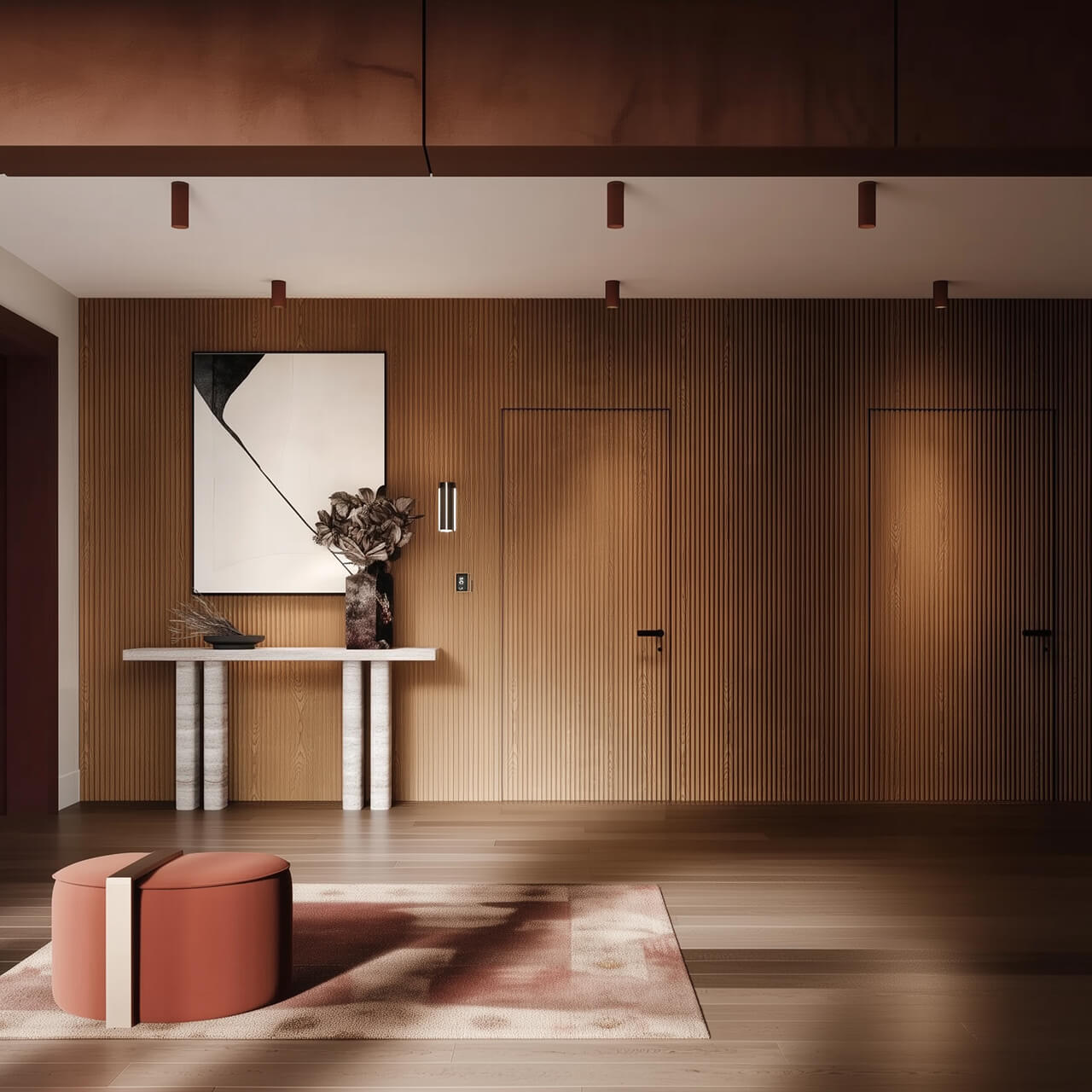 - מסדרון מסוגנן עם חיפוי עץ אנכי