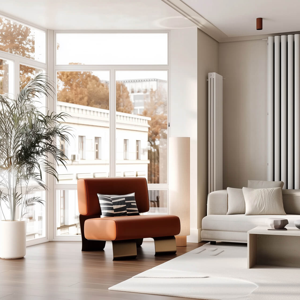 - סלון מואר עם ריהוט מודרני, טקסטורות חלקות וחלונות גדולים המכניסים אור טבעי.