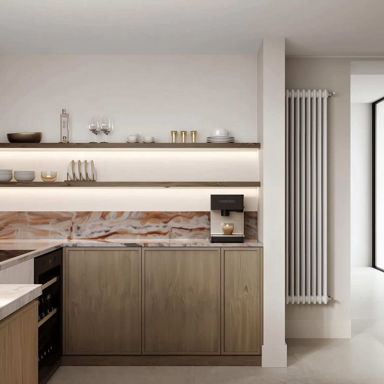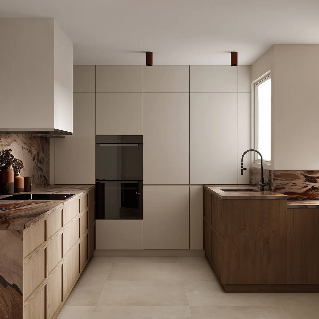 - מטבח נפרד עם משטחי אבן וקיבוע אחורי בגוונים מינרליים חמים