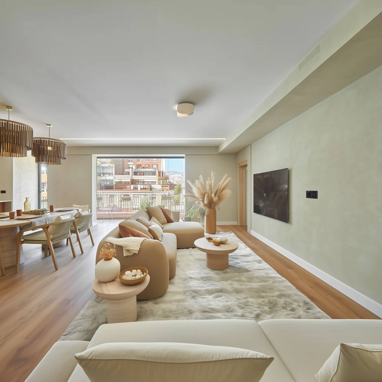 Бұл жарық, екі бөлмелі пәтер, 58 шаршы метр , заманауи, минималистік стильде безендірілген. Интерьер ақ қабырғаларды, тегіс беттерді және мол әйнектерді біріктіріп, балғындық пен кеңдік сезімін тудырады.