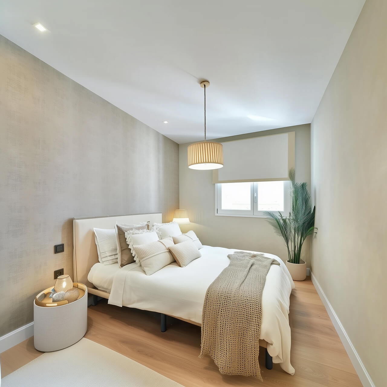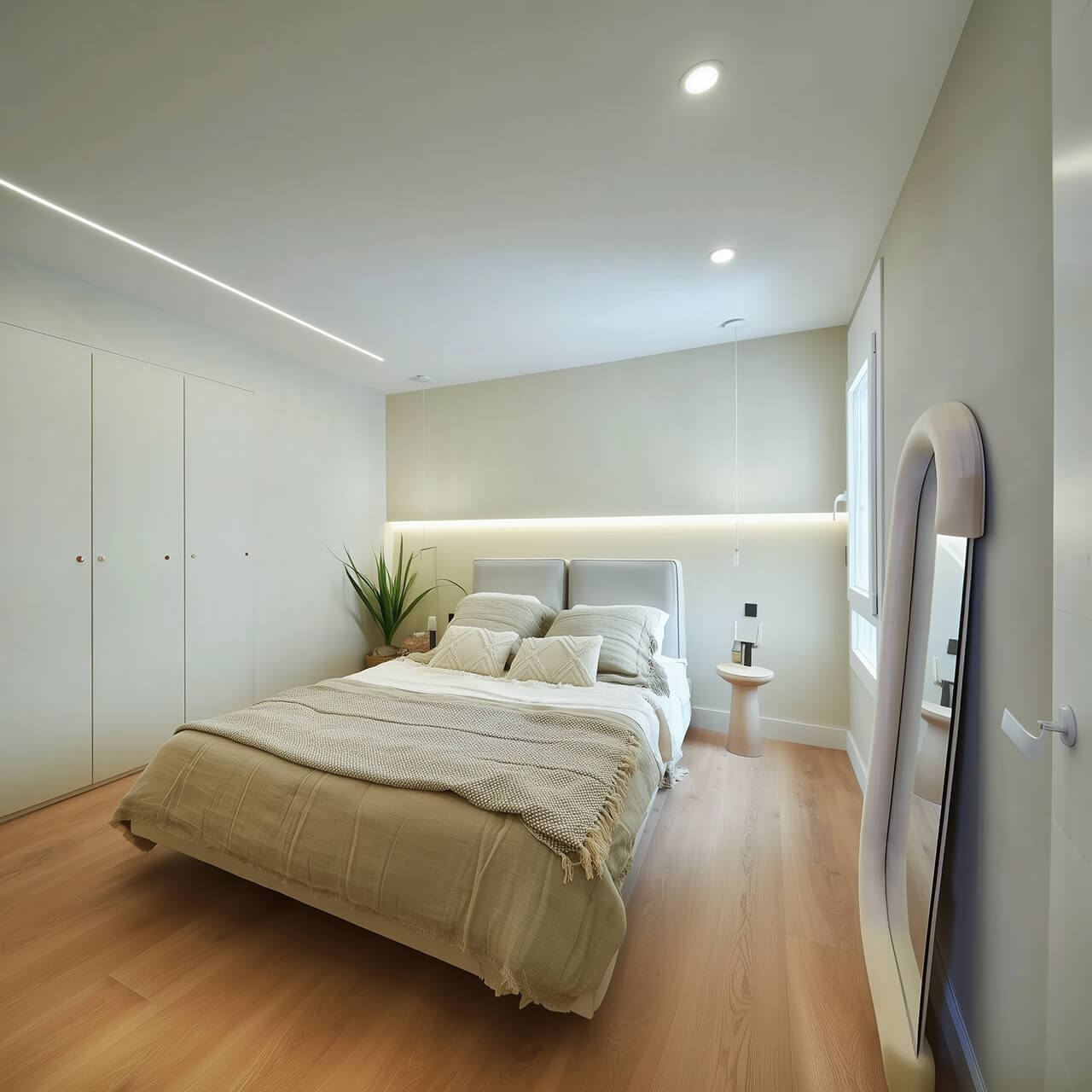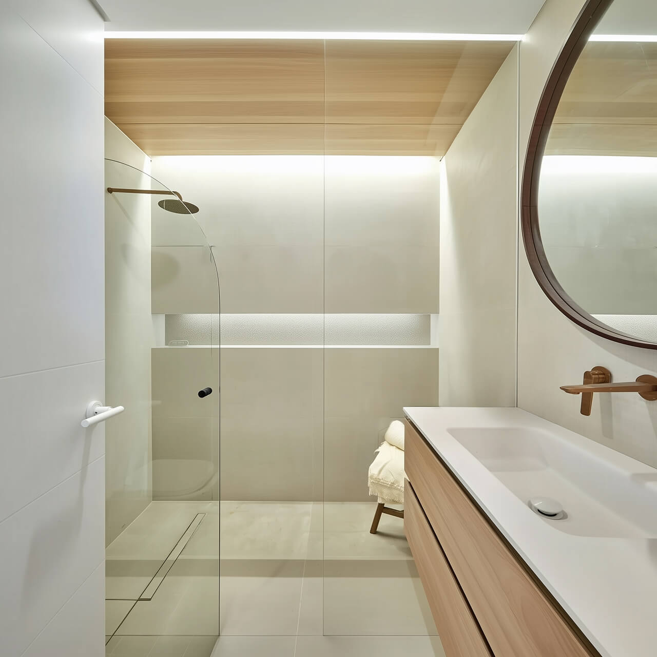 Жатын бөлменің тыныш реңктері жайлы ұйықтау кеңістігін құруды жеңілдетеді. Жуынатын бөлме бейтарап сұр және ақ реңктермен безендірілген және заманауи құрылғылармен жабдықталған.