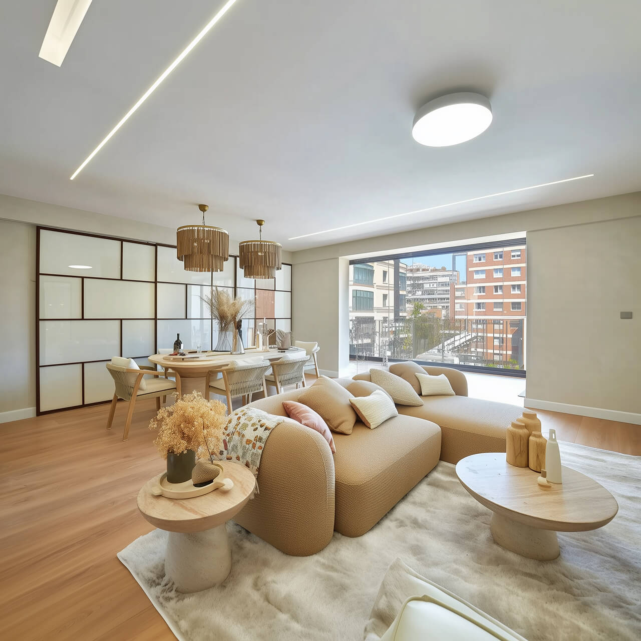 - Үлкен терезелері бар жарық қонақ бөлмесі