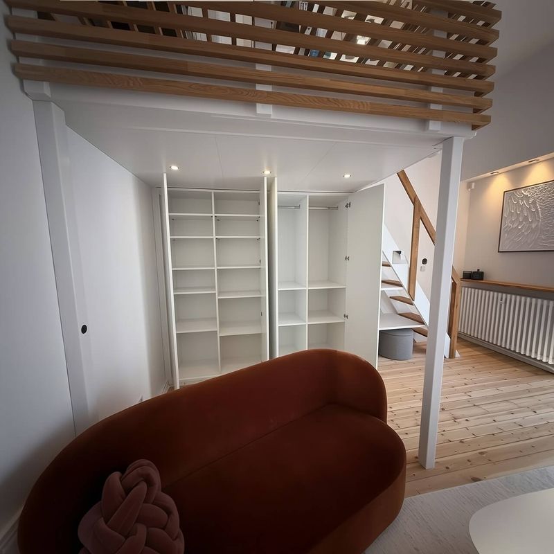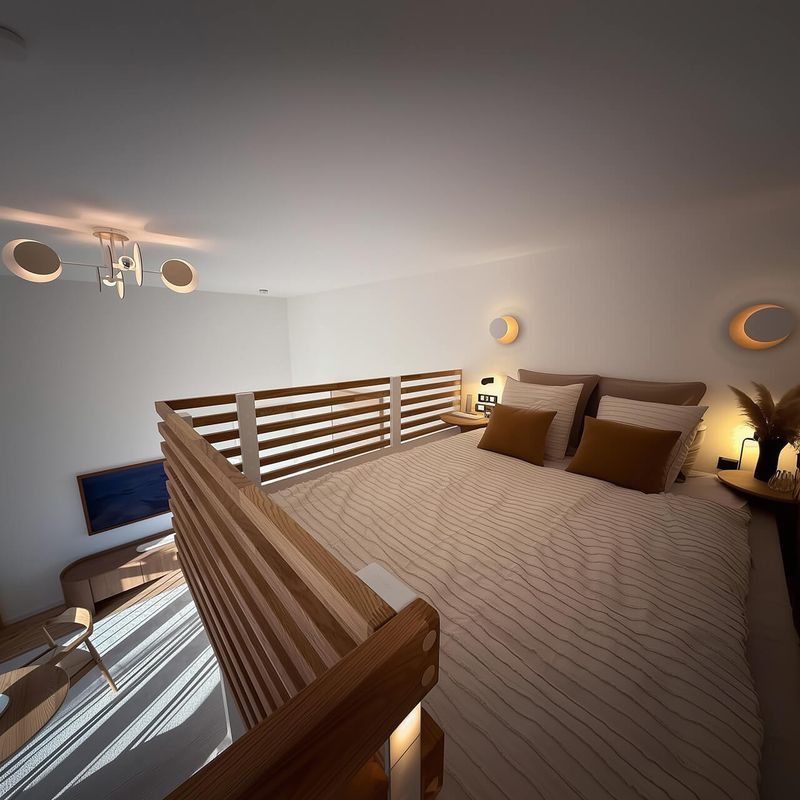 Спальня на мезонине, что создаёт дополнительный уют и эффективно зонирует пространство