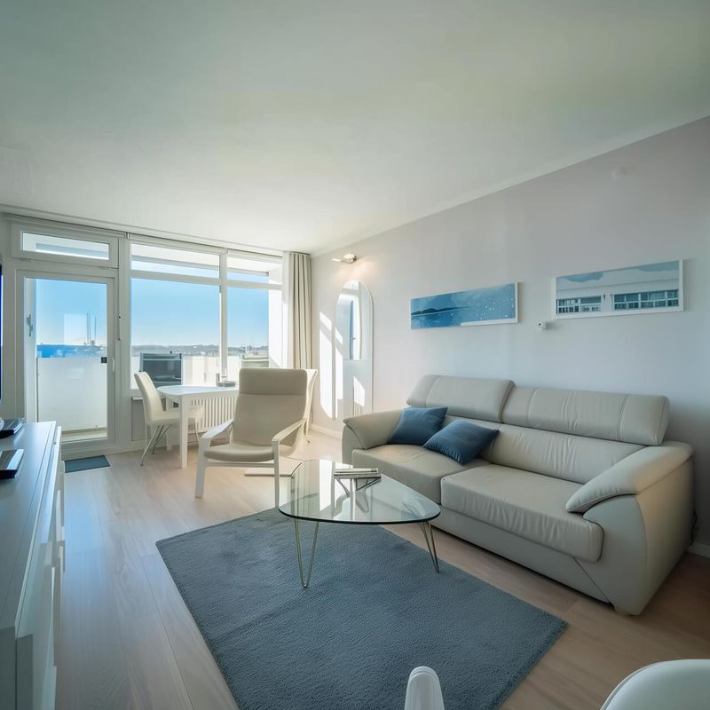 Просторная гостиная с большими окнами, наполненная естественным светом