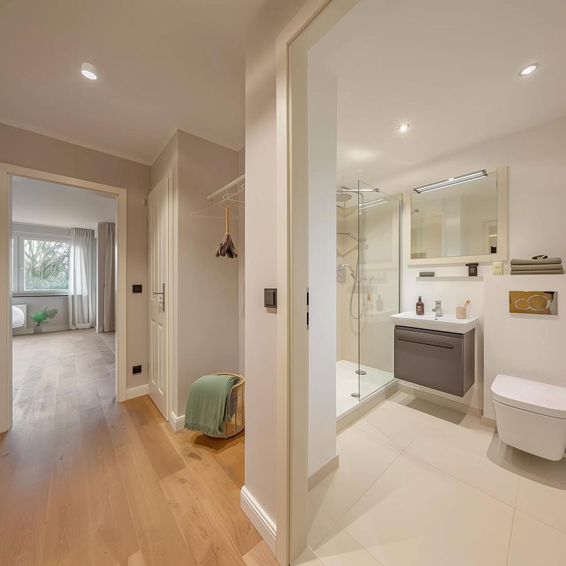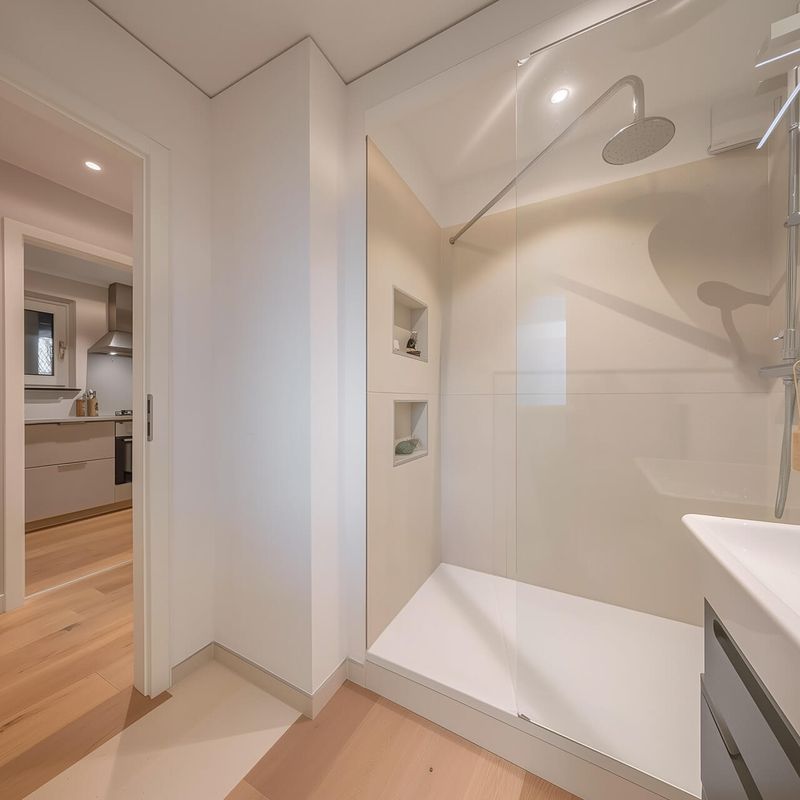 Стильную ванную комнату с душевой кабиной и современной сантехникой