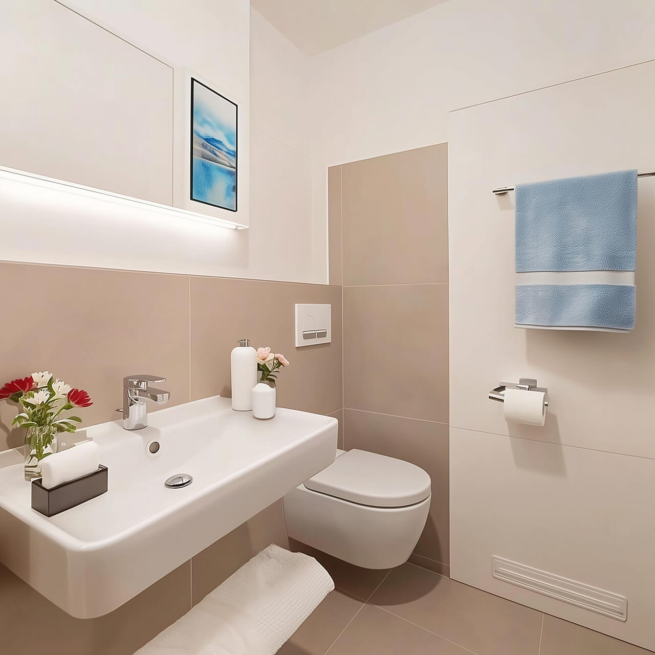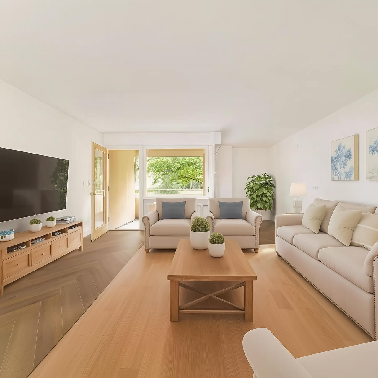 Интерьер выполнен в светлых и тёплых оттенках, что создаёт ощущение простора и уюта.