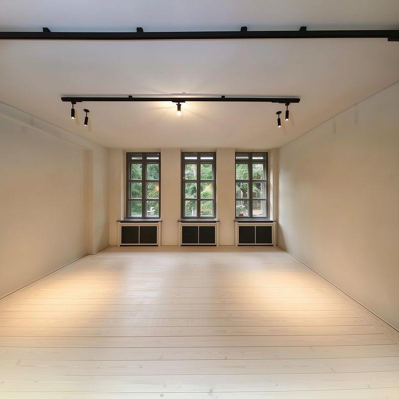 Просторная гостиная с большими окнами и естественным освещением