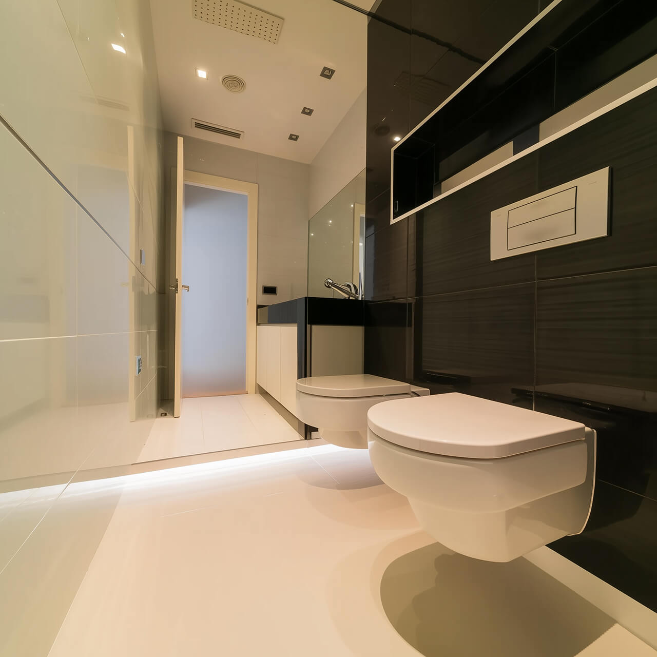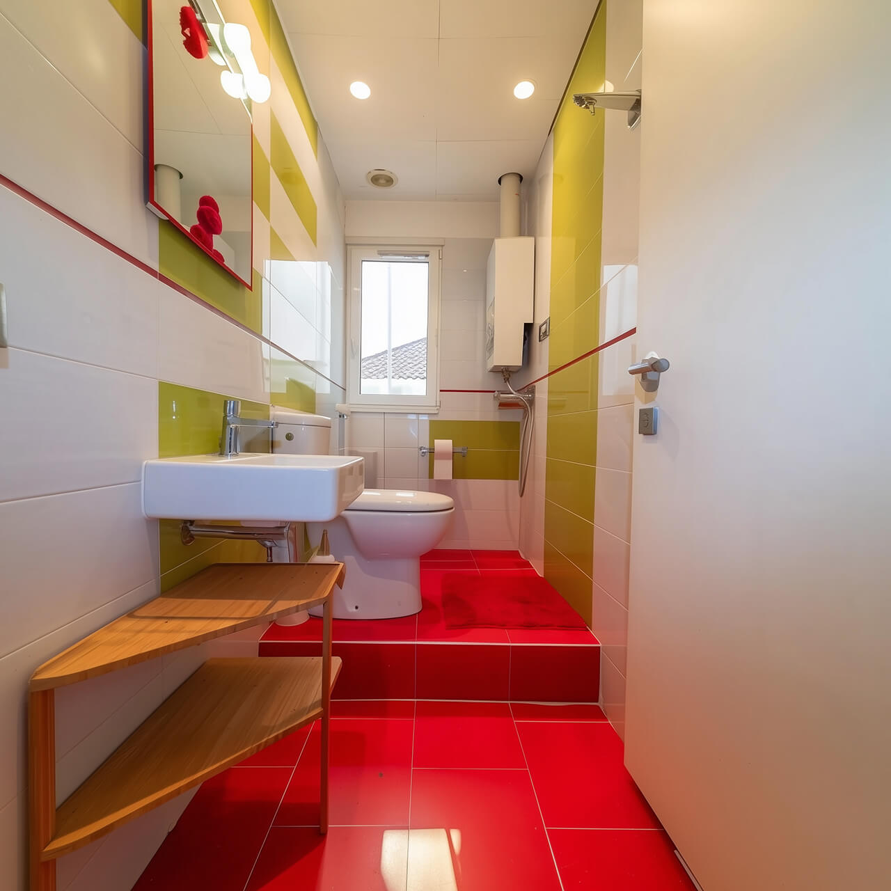 - Два санузла в разной стилистике: лаконичный чёрно-белый и более яркий с окном