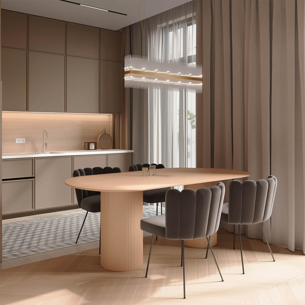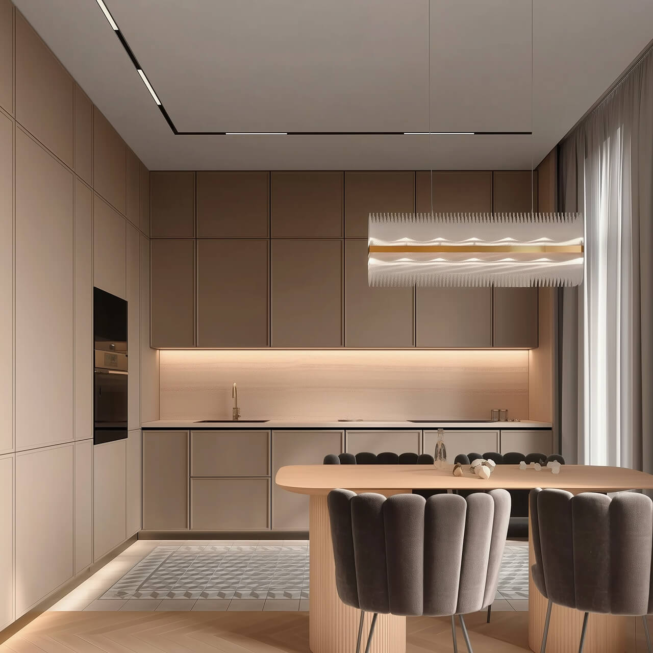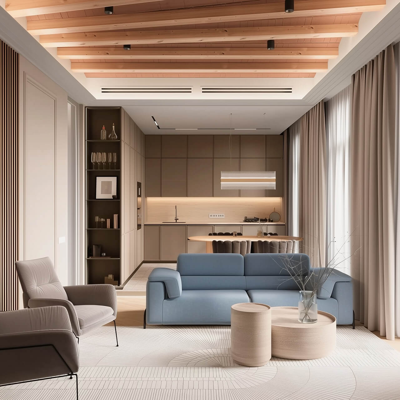 Главное пространство квартиры — объединённая гостиная с кухней и столовой зоной. Большие окна и длинные шторы от пола до потолка наполняют помещение естественным светом, а лаконичная кухня с ровными фасадами и скрытой подсветкой выглядит современно и не перегружает интерьер.