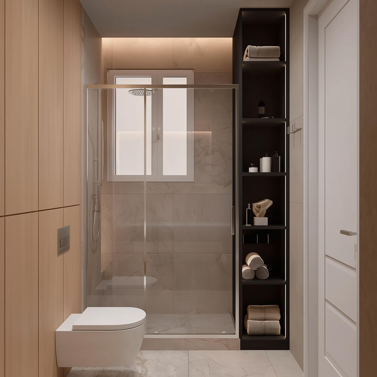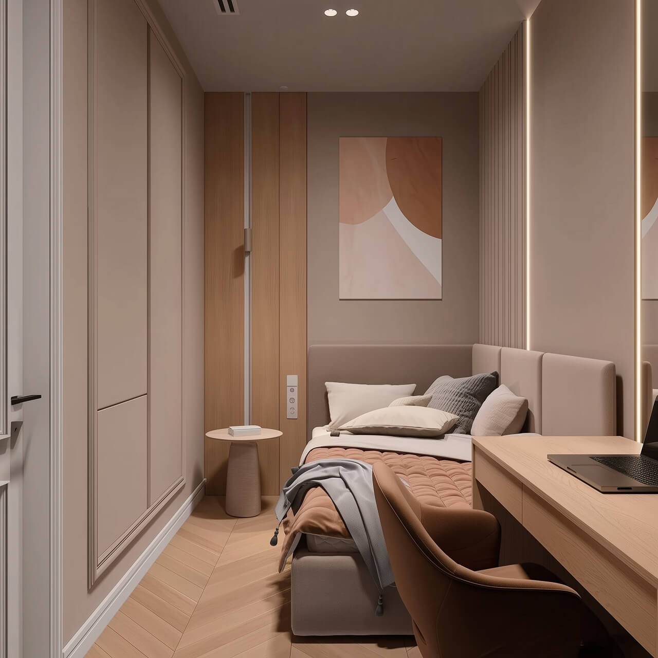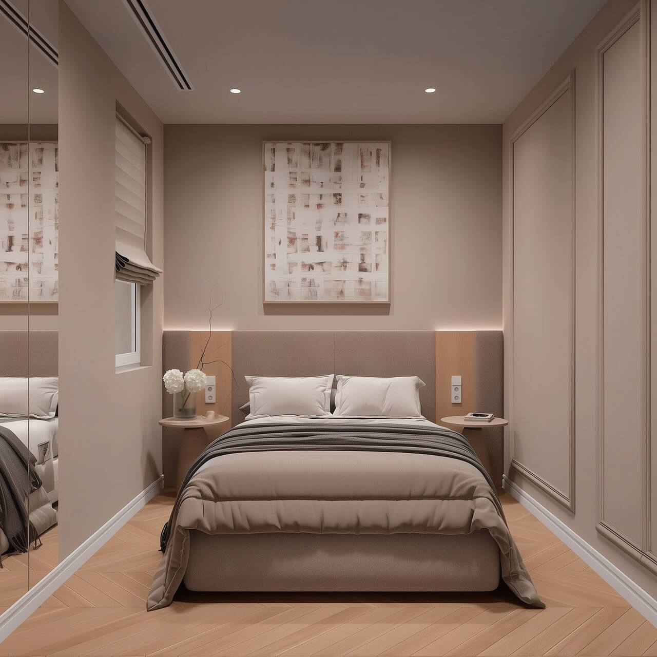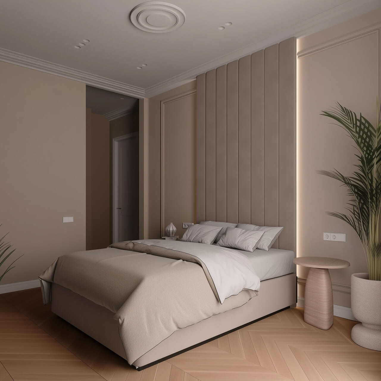 Уютная спальня оформлена в спокойных, тёплых тонах и имеет мягкое изголовье и место под большую кровать. За счёт аккуратных линий и продуманного освещения это пространство легко адаптировать под личные предпочтения — от минимализма до более декоративных решений.