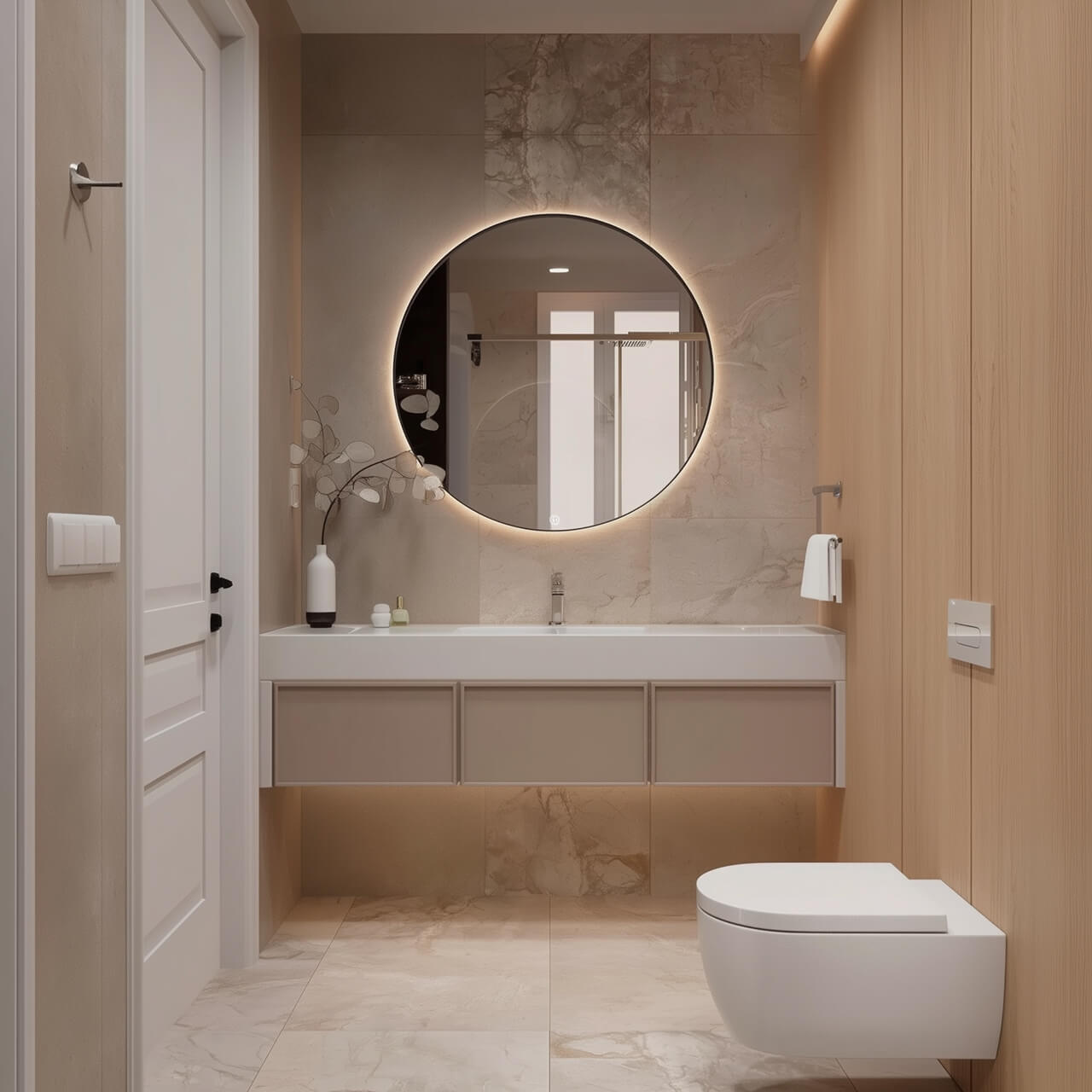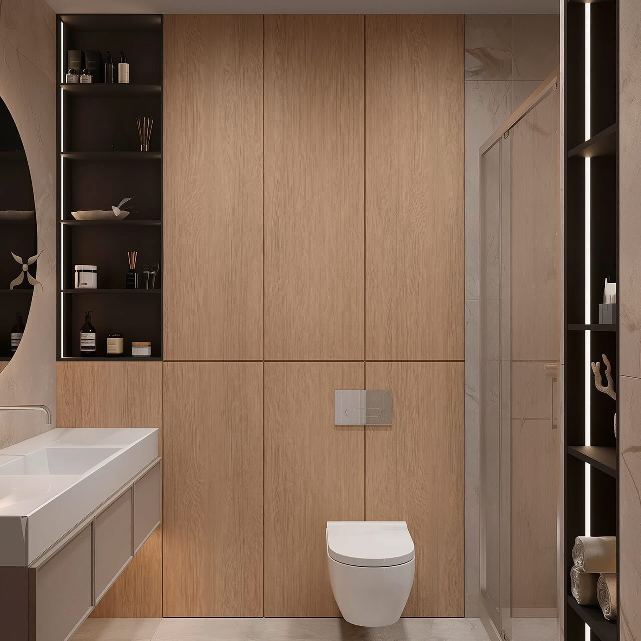 В квартире предусмотрены современная ванная комната с душевой зоной и отдельный гостевой санузел. Крупный круглый зеркальный элемент, качественная сантехника и благородная отделка создают ощущение домашнего спа и поддерживают общий высокий стандарт объекта.