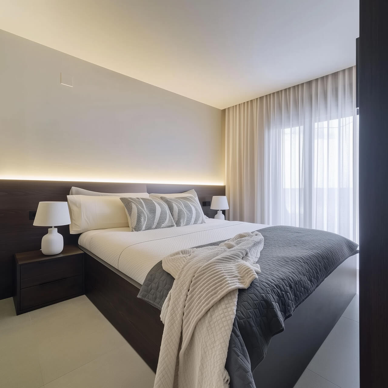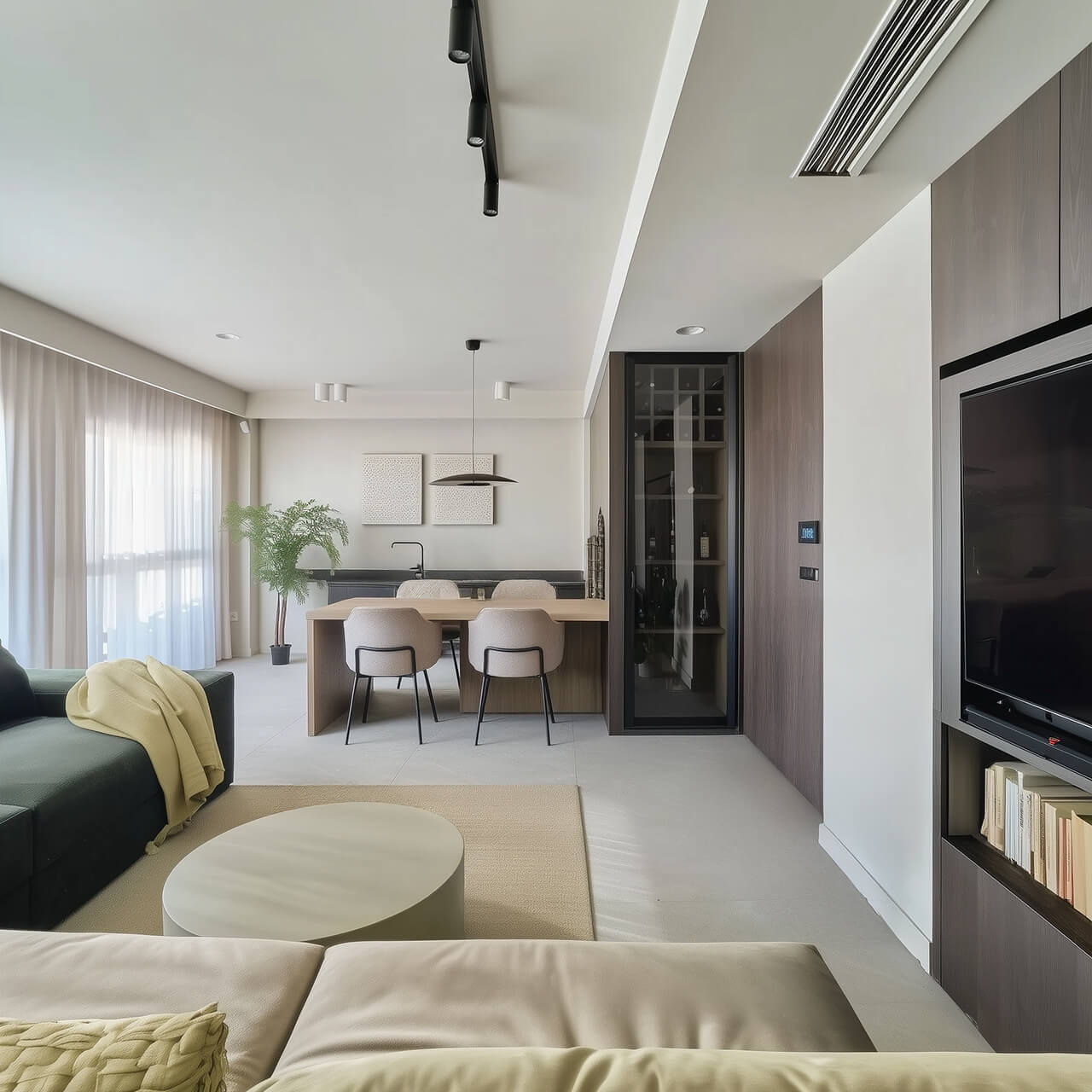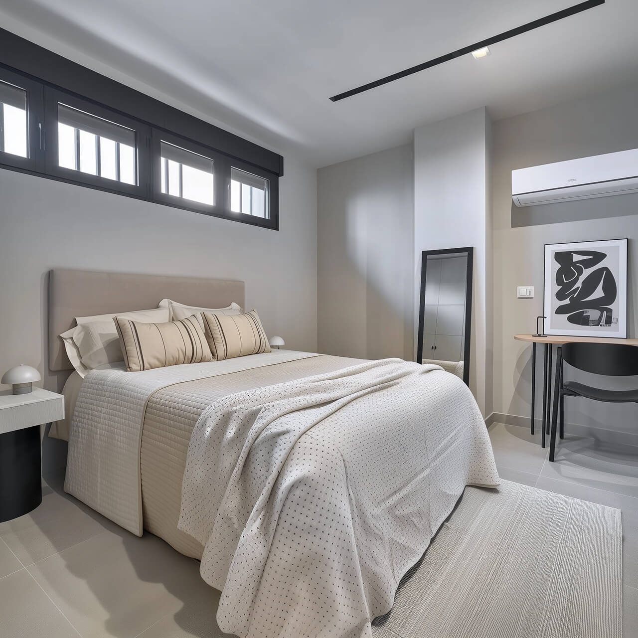 Двухкомнатная квартира 75 м²: интерьер выполнен в современном минималистичном стиле: светлая база, ровные линии, много встроенного и направленного освещения. В спальне спокойная нейтральная палитра, кондиционер и достаточно места, чтобы организовать хранение.