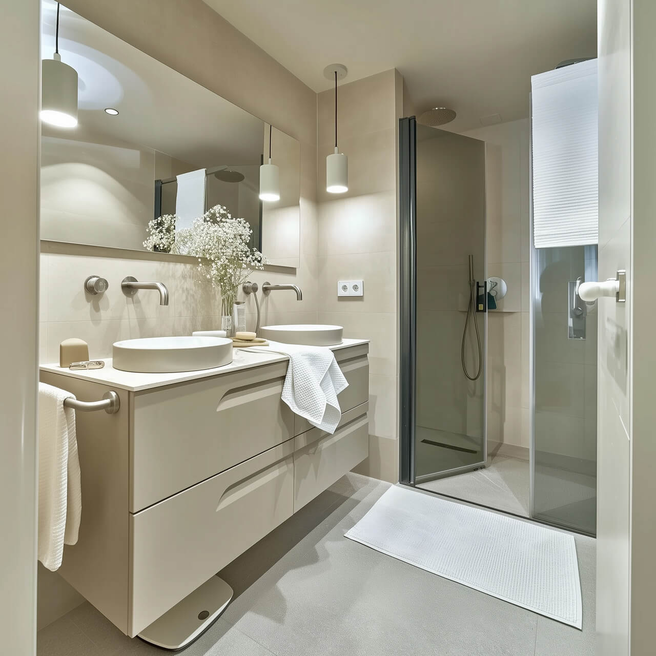 Ванная комната оформлена функционально: стеклянная душевая, две раковины, настенные смесители и подвесные светильники. Дом с современным фасадом и балконами со стеклянными ограждениями поддерживает общий уровень объекта.