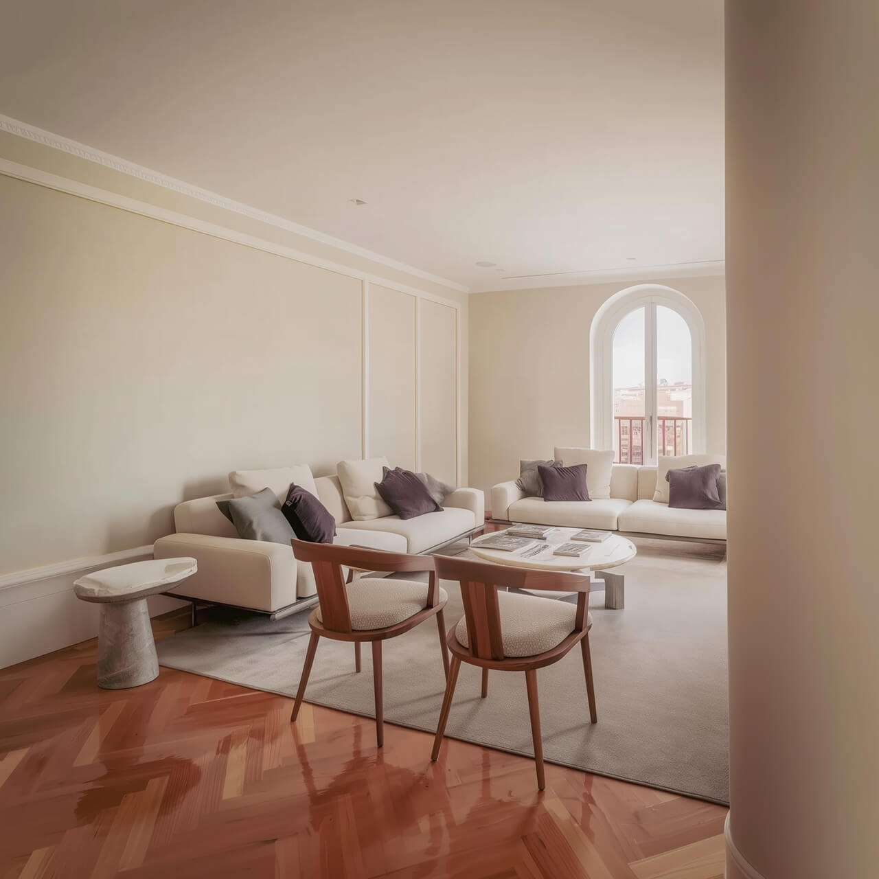 Гостиная задаёт настроение всей квартире: большие окна наполняют её дневным светом, а спокойная отделка делает интерьер универсальным. Здесь можно выделить зоны для отдыха, работы и приёма гостей. Отдельная спальня подходит для уединения и полноценного отдыха.