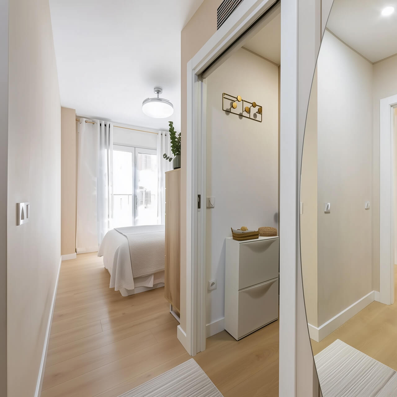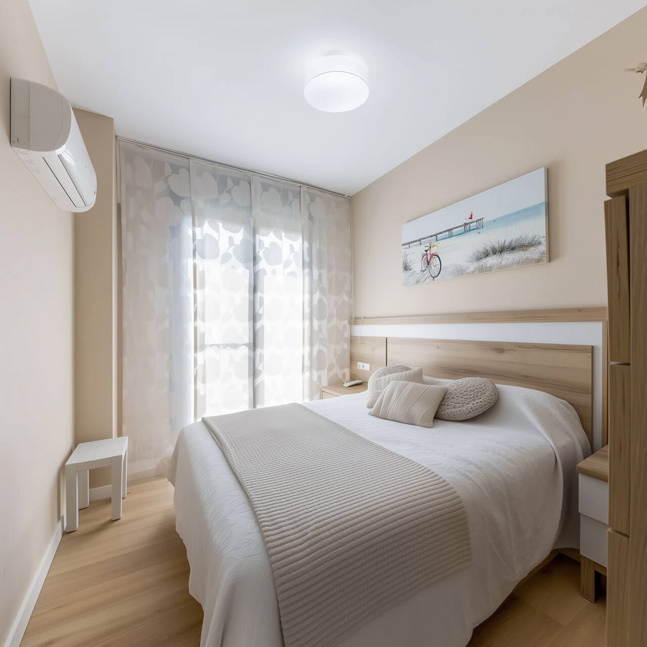 Две изолированные комнаты удобно разделяют приватную и общую зоны. Спальня подходит под двуспальную кровать и хранение, а кондиционер помогает поддерживать комфорт летом. Во второй комнате разместили рабочее место у окна и кровать-трансформер в шкафу, поэтому помещение легко использовать как кабинет, детскую или гостевую.