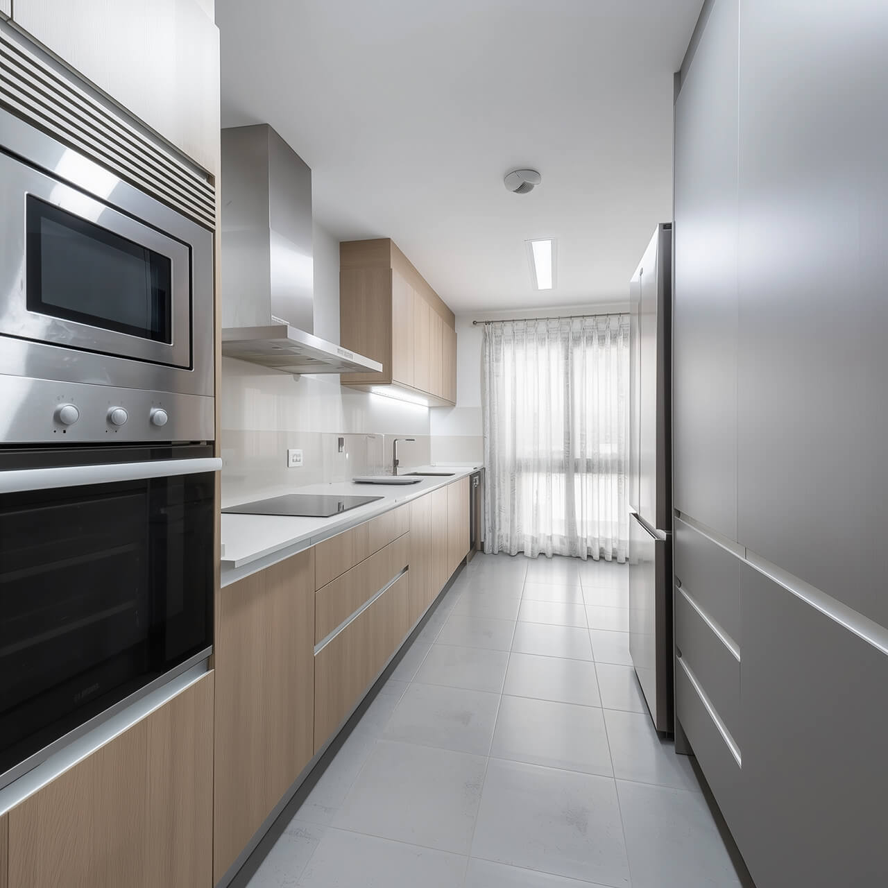 Отдельная кухня-галерея идёт вдоль стены и даёт много места для хранения и готовки. Встроенная техника включает духовой шкаф и микроволновую печь, а окно в конце кухни добавляет естественного света.