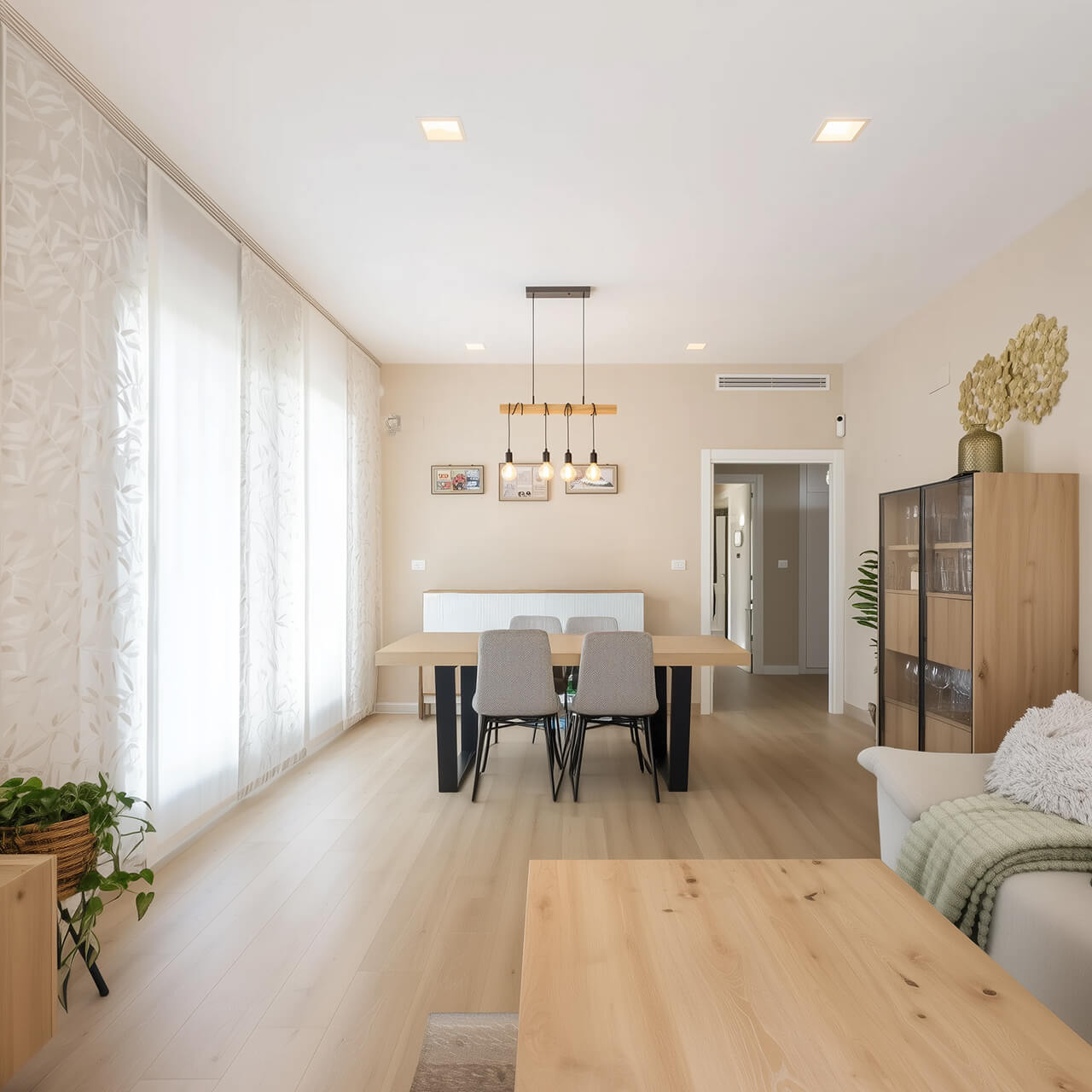 Эта 3-комнатная квартира площадью 92 м² оформлена в спокойной современной стилистике и светлой гамме. В гостиной-столовой много дневного света: большие окна, лёгкие шторы и тёплый оттенок напольного покрытия усиливают ощущение простора. Над обеденной зоной висит выразительный светильник, который добавляет интерьеру характер и делает пространство уютным для вечеров дома и встреч с друзьями.