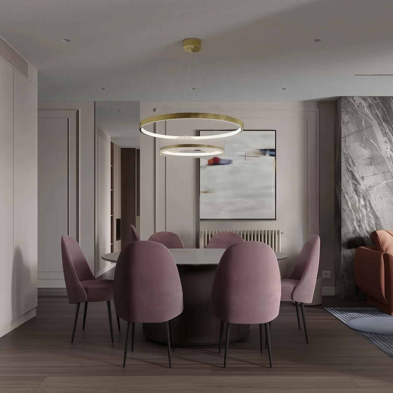 - Светлая гостиная с рабочей и обеденной зонами