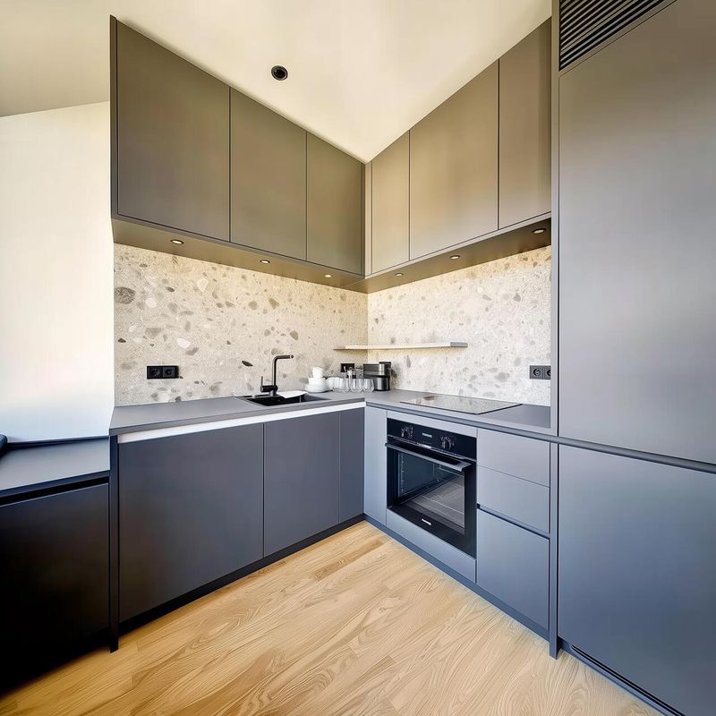 Современная кухня с качественной встроенной техникой и стильными мраморными акцентами
