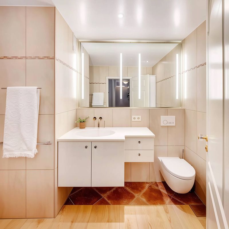 Ванная комната с современной сантехникой и плиткой в спокойных тонах
