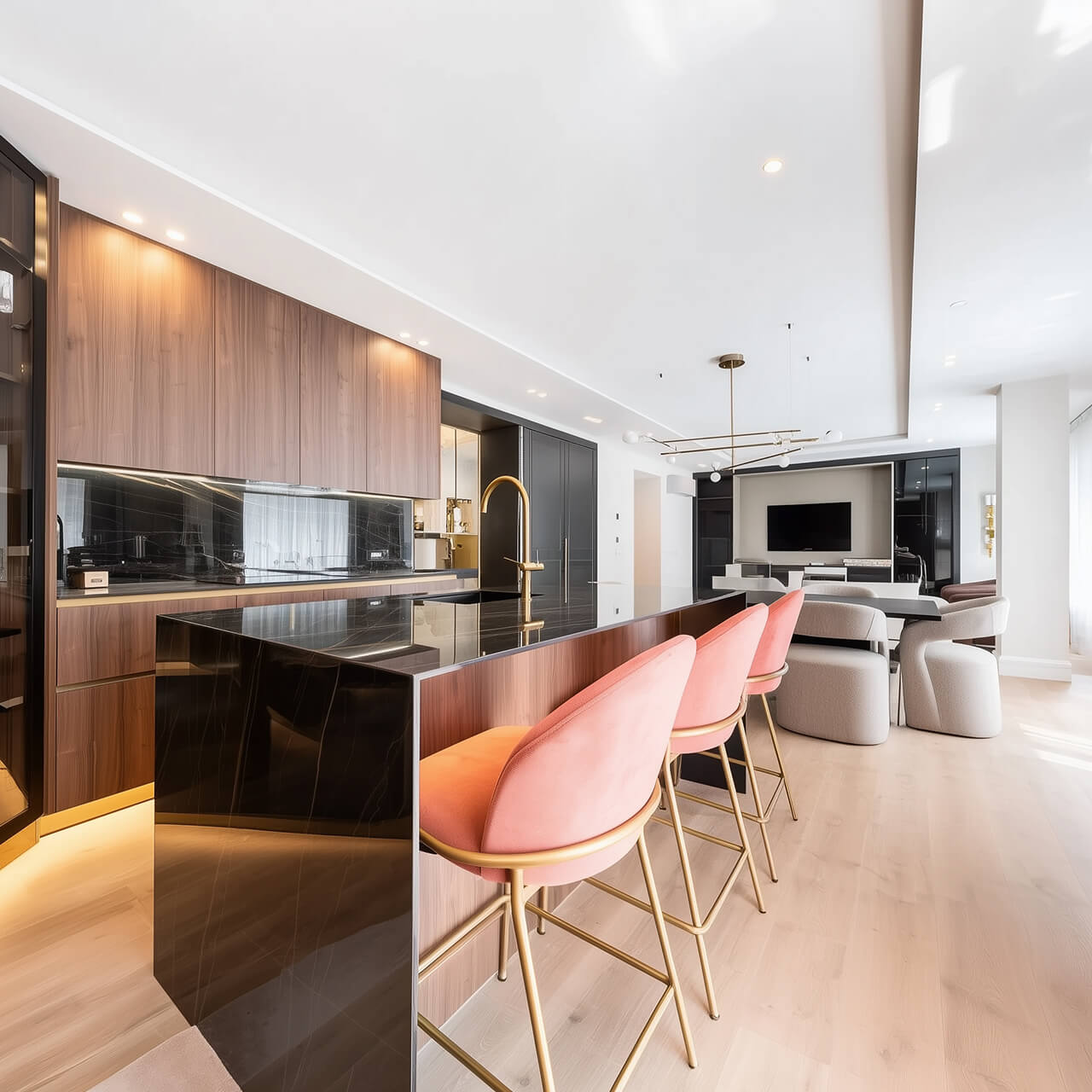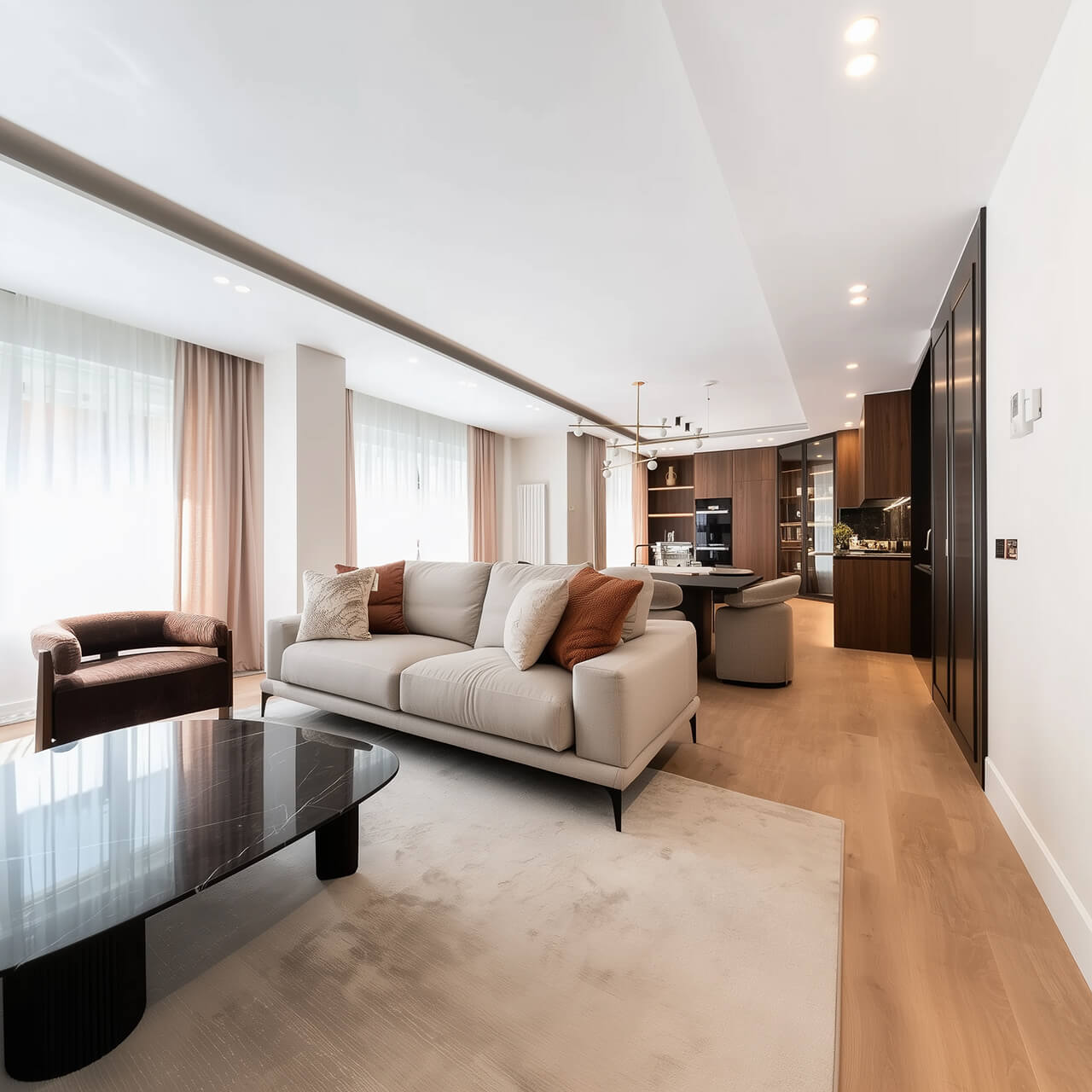 Гостиная — центральное пространство квартиры: здесь удобно выделить зону отдыха, поставить большой диван и организовать домашнюю медиа-зону. Смежные комнаты позволяют гибко настроить пространство под личные потребности: сделать спальни, детскую, кабинет или гостевую.