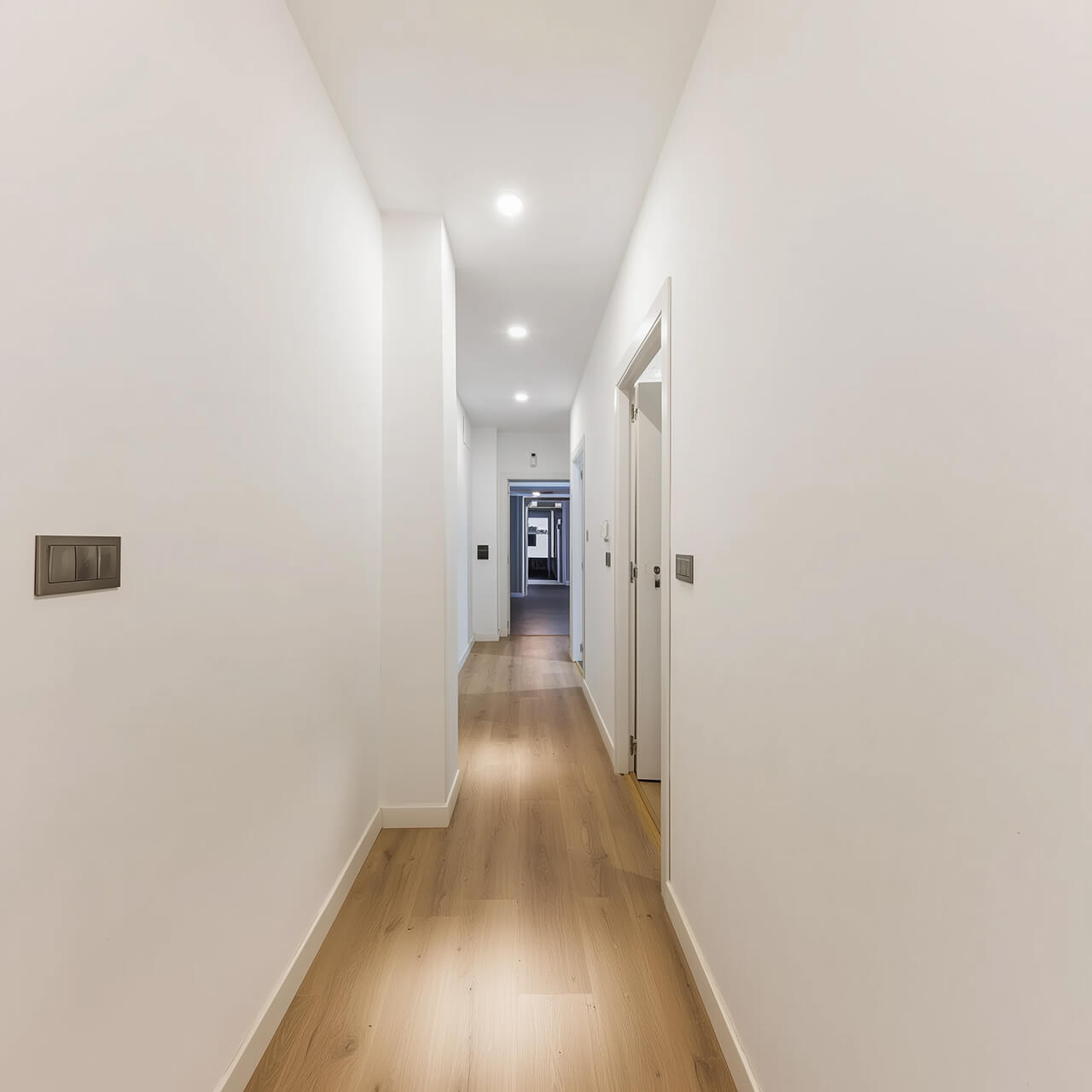 - Длинный светлый коридор с точечным освещением и зонами под хранение