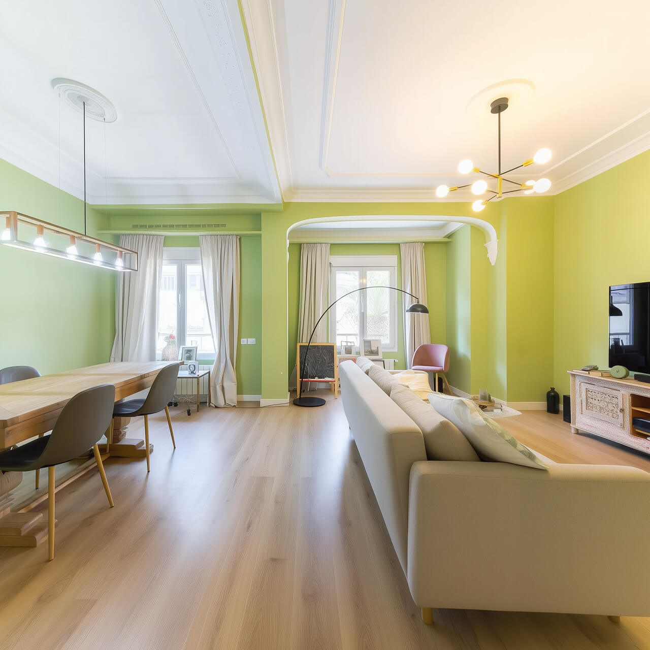 В квартире светлые помещения, аккуратная отделка и тёплый деревянный пол. Гостиную легко обустроить под зону отдыха и столовую, а высокий потолок добавляет ощущение простора.