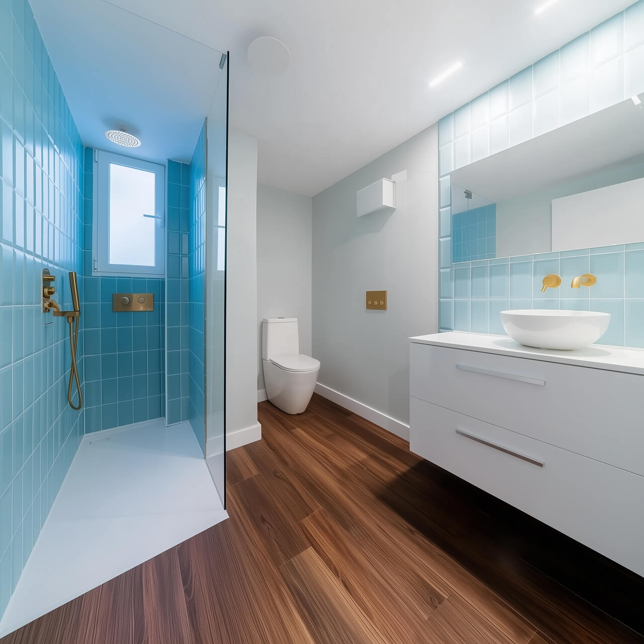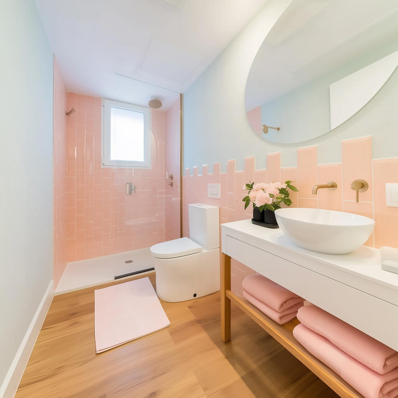 - Два санузла в разных оттенках: «пудровый» и голубой