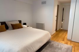 Este apartamento de um quarto (48 m²) é perfeito para quem aprecia um estilo moderno e tranquilo. As grandes janelas proporcionam muita luz natural, enquanto os pisos de madeira clara e os tons neutros ampliam visualmente o espaço.