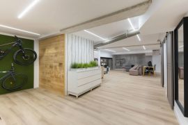 1-кімнатна квартира 78 м ² у форматі сучасного міського лофта. Великі вікна, світлі стіни та підлога з оздобленням під дерево роблять простір світлим та візуально просторим. На стелі вбудовані світлові лінії, які дають рівне освітлення.