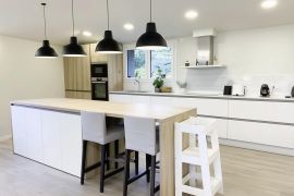 厨房设有宽敞的中岛台面和简洁的白色橱柜;工作区上方悬挂的吊灯更添几分特色。公寓有两个独立的房间:一个可用作卧室,另一个可用作婴儿房或书房(布局灵活,可根据不同需求进行调整)。